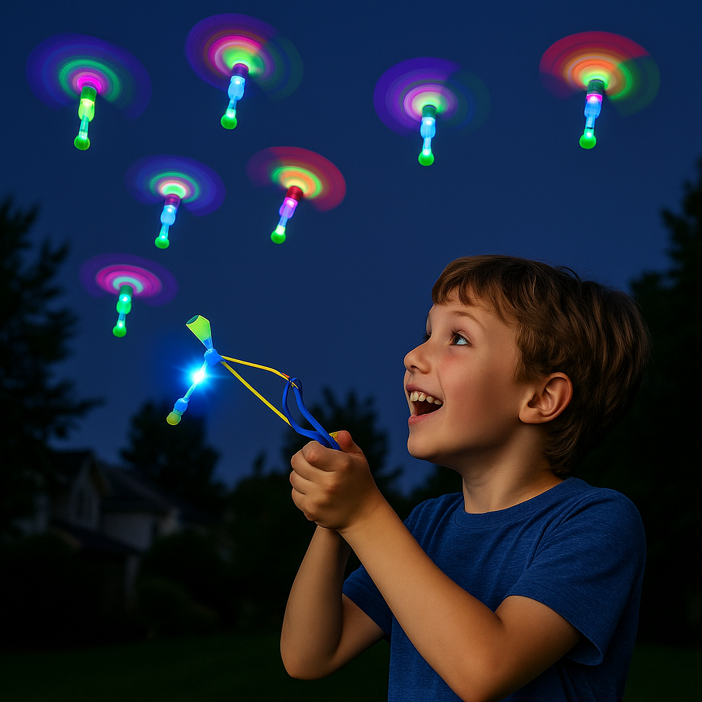 Let the thrill take flight after dark with AeroFlick—a luminous LED slingshot flyer that soars skyward in a radiant burst and gracefully descends like an enchanted rocket, transforming backyards, parks, and gatherings into exhilarating nighttime experiences.