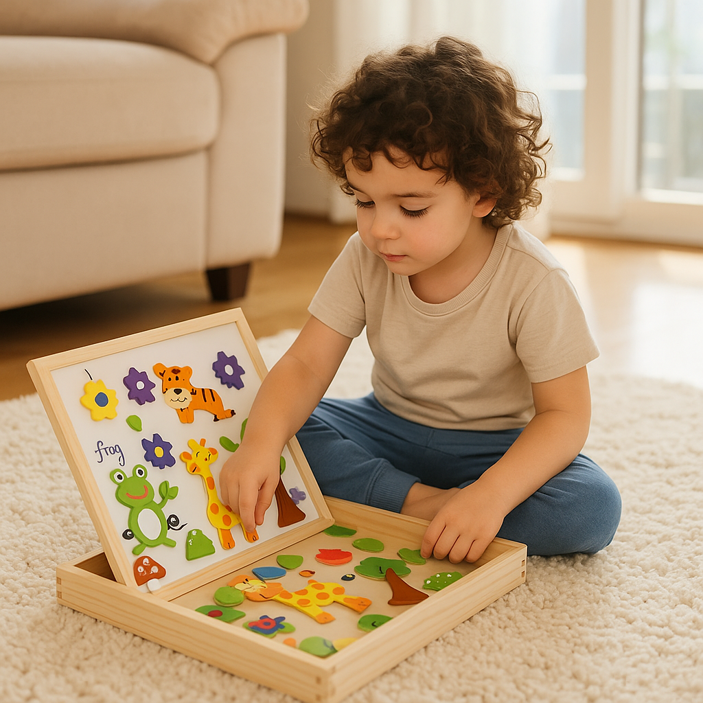 My toddler loves this toy! He has been playing with it for almost 4 months now. In the beginning, he mostly enjoyed sorting the pieces and randomly covering the board with them. I think it's better than a simple puzzle because it's an open-ended toy that also encourages creativity. We haven't used it for drawing yet, but in my opinion it's worth buying just for the magnetic board and the pieces!