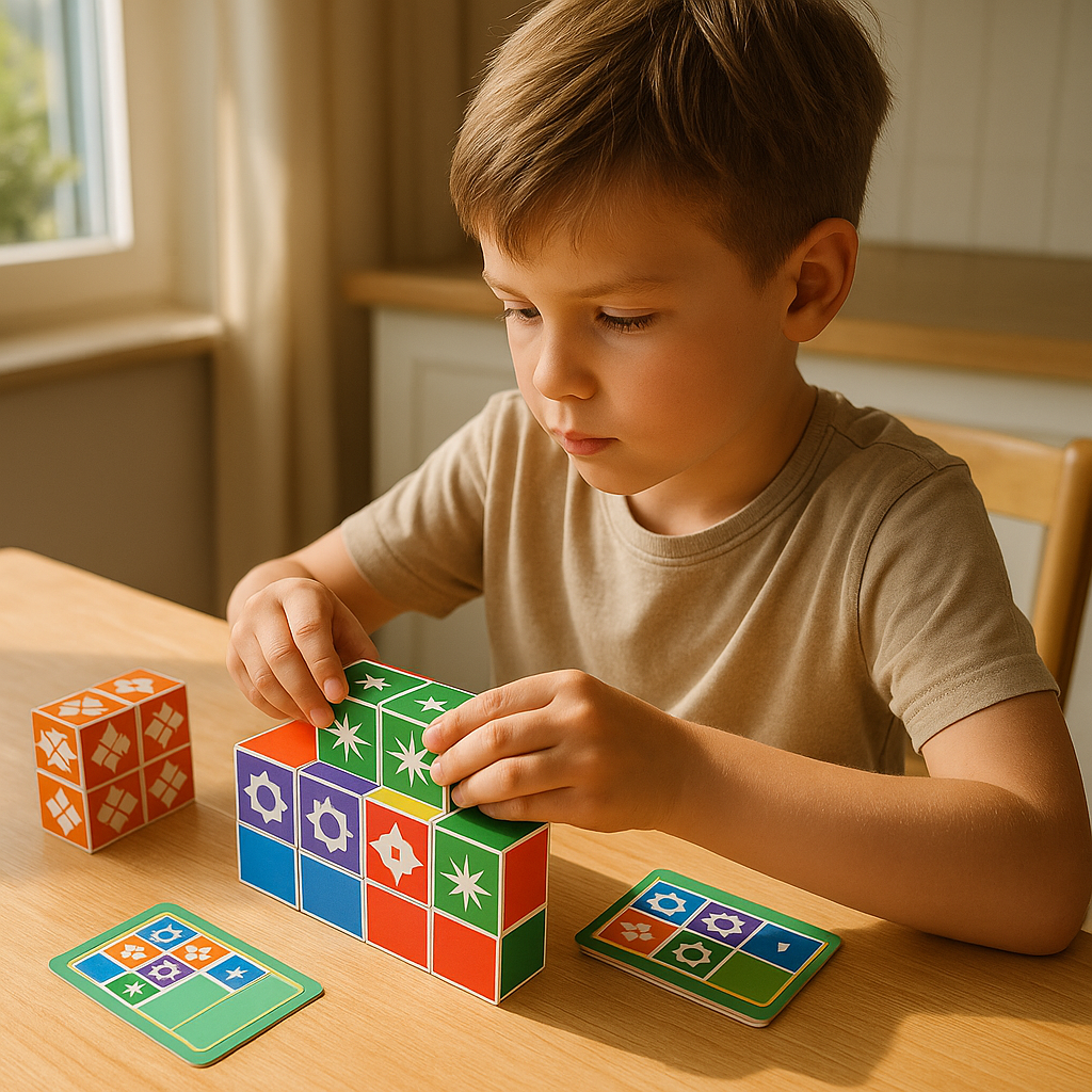 Step 3: The player who first accurately reproduces the pattern shown on the card wins the round. You play the game until all the cards in the game have been used up. The person who collects the most cards wins the game!