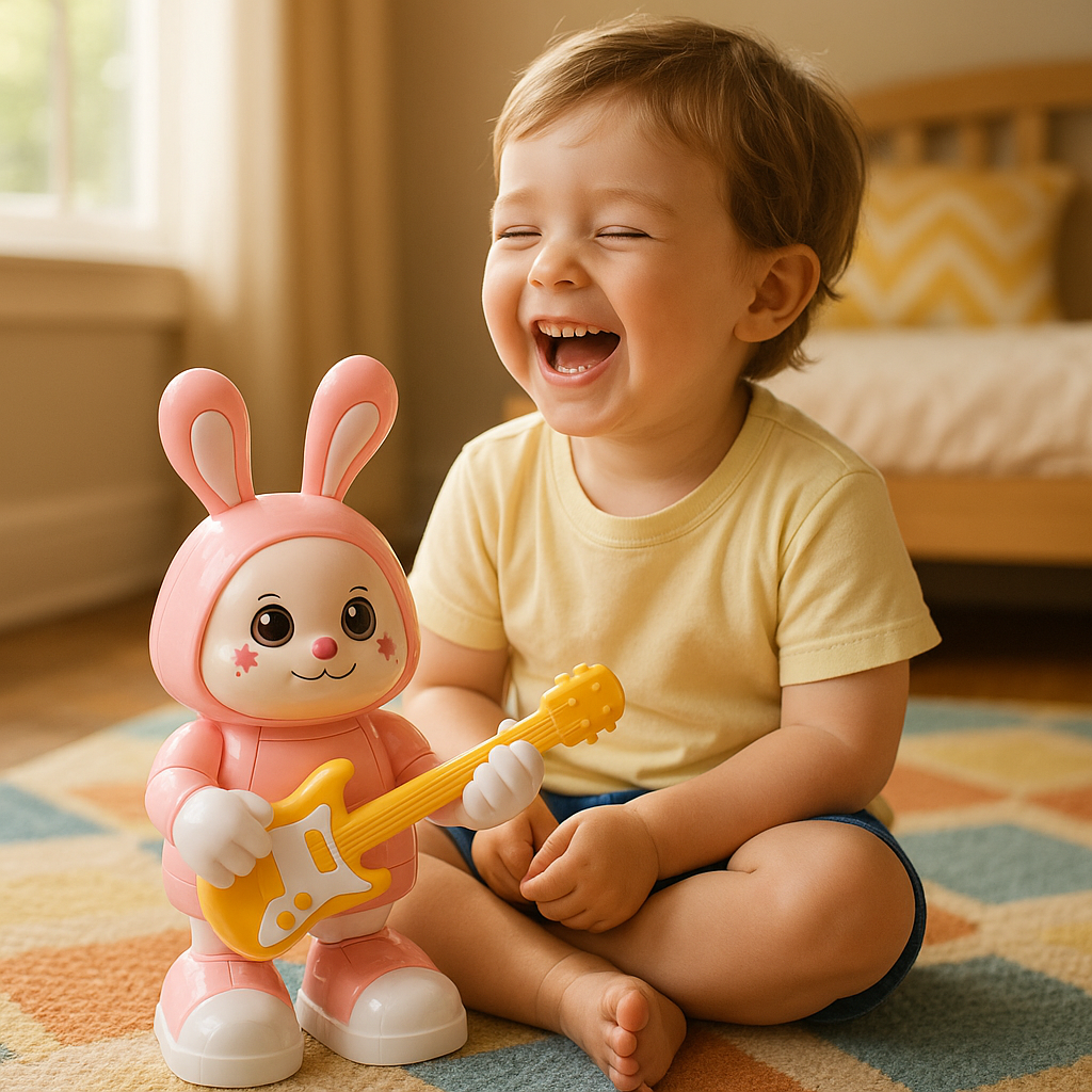 Introduce your little one to the enchanting world of music and movement with Bunova, the charismatic rabbit guitarist that delivers joy, inspiration, and entertainment through its vibrant lights, catchy melodies, and charming presence.
