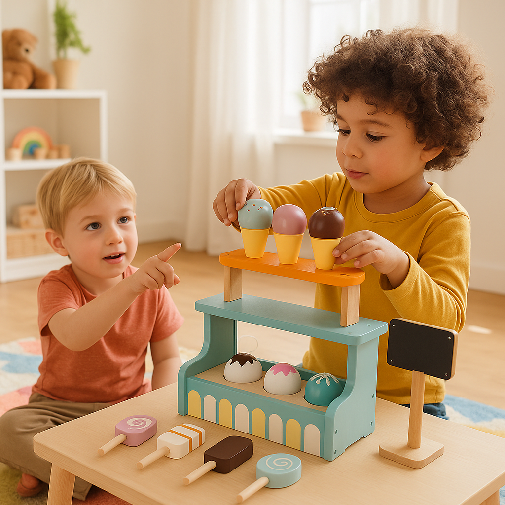 Turn playtime into an exciting adventure filled with creativity, social interaction, and imaginative learning through Crafterra - the Montessori Wooden Ice Cream Shop Playara, where your child can concoct, role-play, and discover while forging cherished memories and achieving developmental milestones.