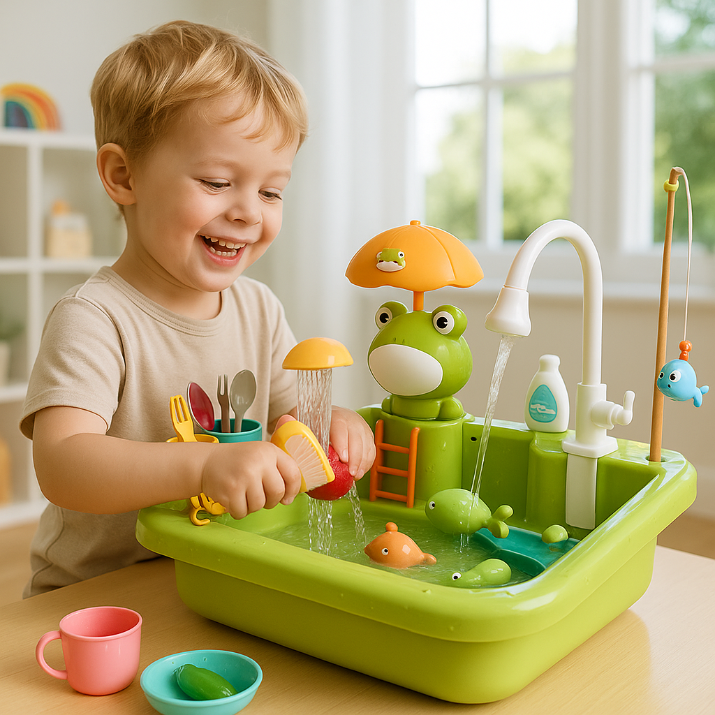 This is my Grandson's favourite toy. He's 21 months. He enjoys the running tap and being able to operate it himself. And he loves the little frogs 🙂