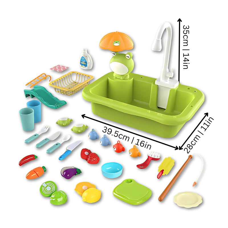 I love all the pieces to this set, it makes it so versatile. You can Wash Fruit. You can Go fishing. You can slide the little frogs down the slide. I love that there are 3 different ways to play with this sink or you can play with it all together which is what my daughter likes to do.
