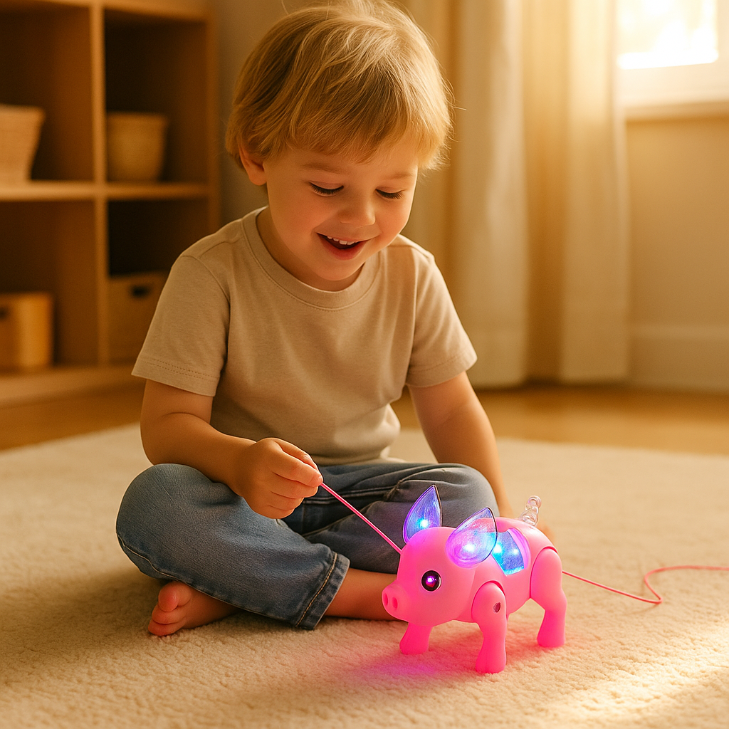 It’s not merely adorable—it’s lively, as well. When your child grips the leash and strolls with their new buddy, they'll experience an engaging blend of activity, sound, and illumination. The pig waddles gracefully, lighting up along the way, while the cheerful tunes maintain a lively atmosphere. It's a vibrant friend that introduces an extra layer of enjoyment to both indoor and outdoor escapades.