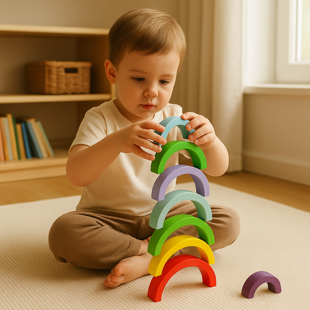 Every twist and turn of these colorful arcs unlocks a realm of creative play. It's more than stacking; it's about crafting stories, building little rainbow towns, or even designing funky bridges for toy cars. And guess what? While they're having a blast, they're also honing fine motor skills and learning about colors and balance.