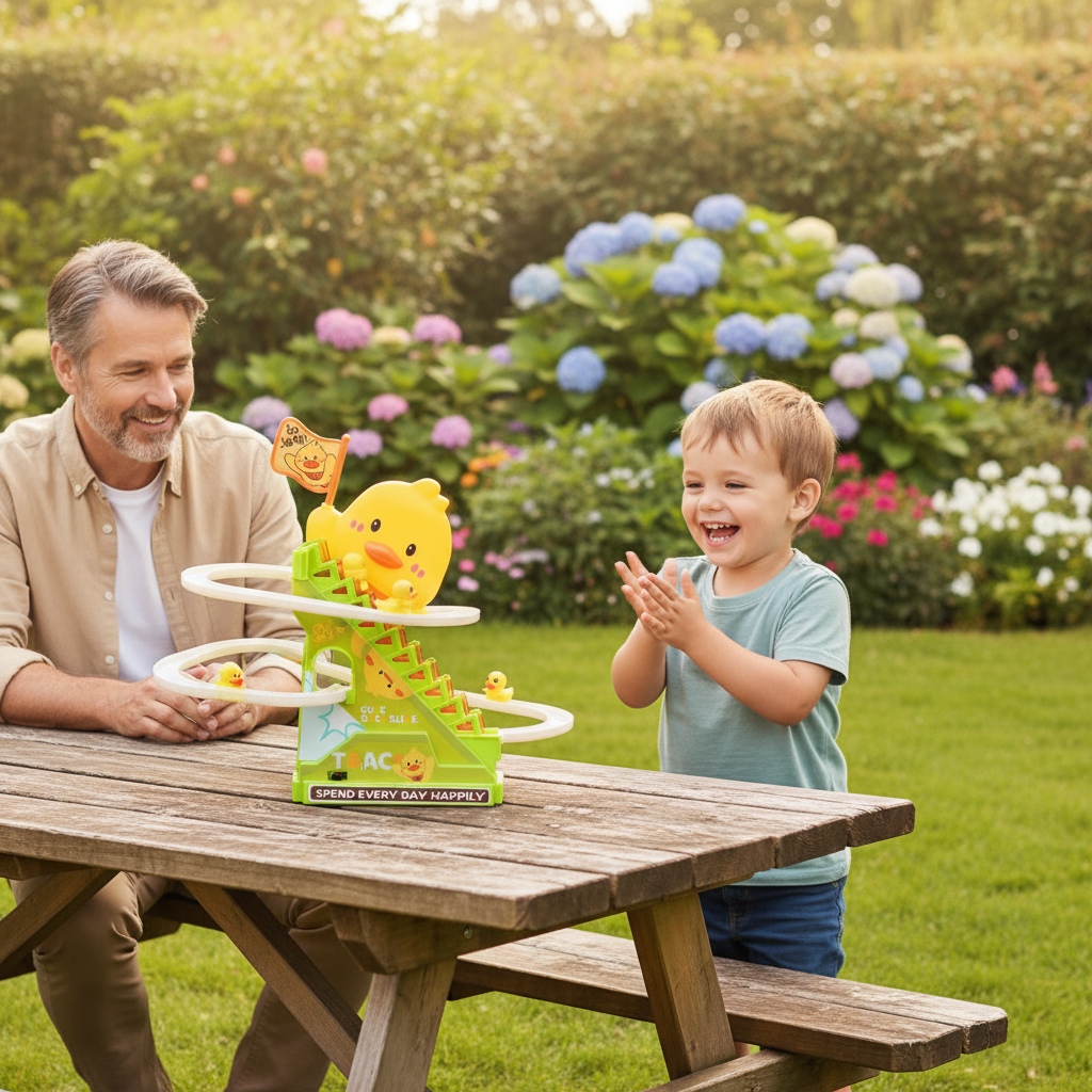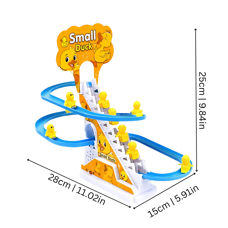 This duck toy is absolutely adorable and my toddler is obsessed with it! The ducks climbing the stairs and sliding down the track is so simple, yet super entertaining to watch. The music is a bit repetitive, but you can always turn it off if needed.