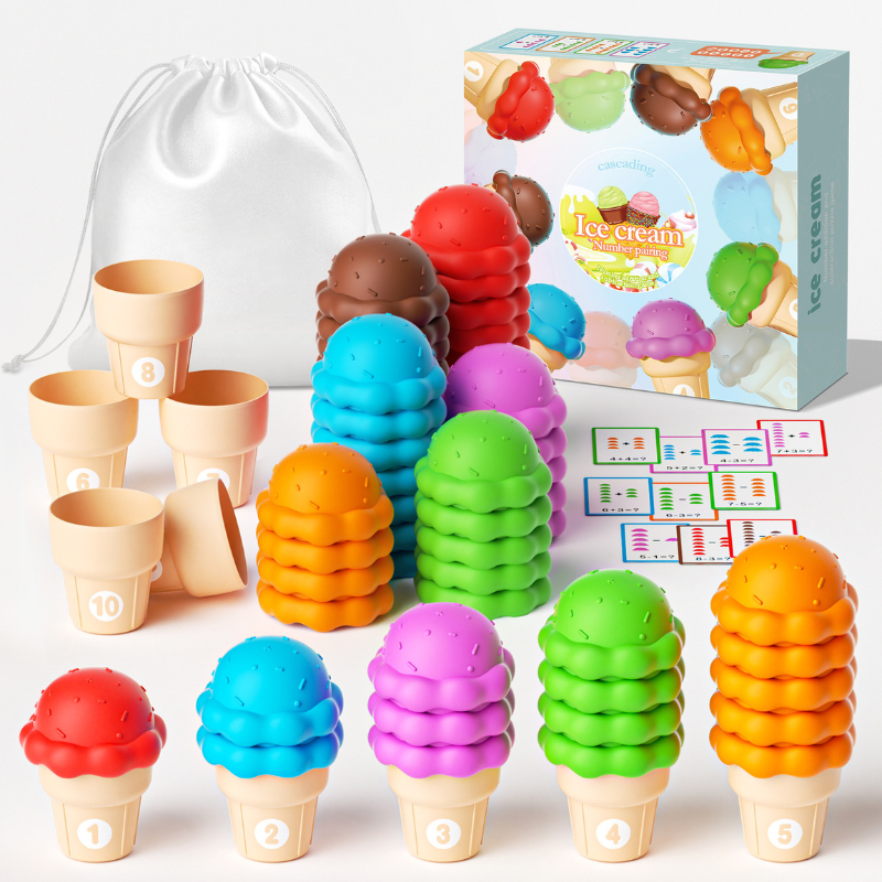 Each scoop features a distinct color and number, making sorting and stacking an engaging mathematical journey. Children can sort by color, count the scoops, or create impressive cones using their imagination. It's an excellent method to incorporate early learning while ensuring your child remains actively involved.