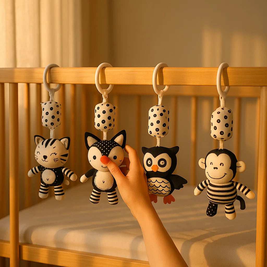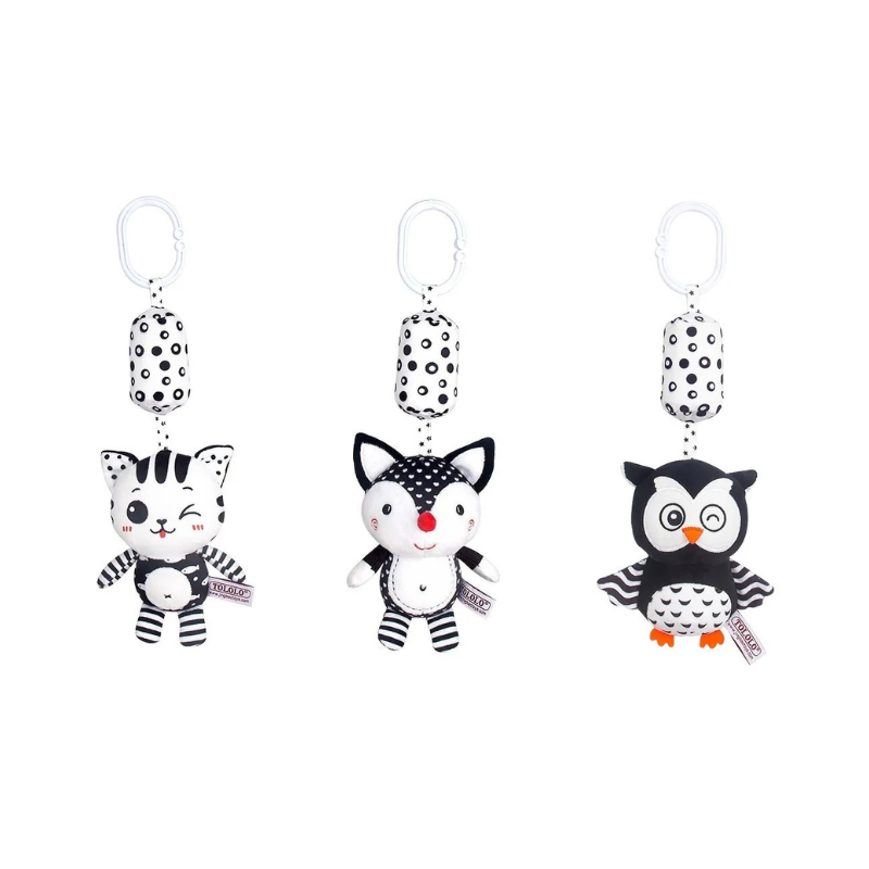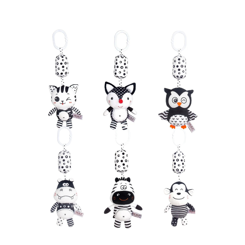 Snugglea's engaging design with high-contrast black and white patterns stimulates visual development. Babies learn to focus and recognize shapes, enhancing their cognitive skills from an early age. They even start grasping names and colors of animals as they play.