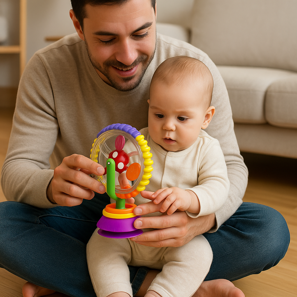 This toy is a lifesaver during mealtime! My baby is totally captivated by the spinning wheel and colorful parts. The suction cup actually holds tight to the tray, which is rare with these kinds of toys.