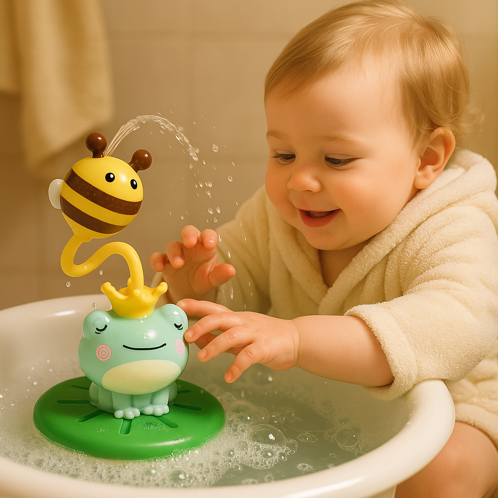 Transform any bath into a majestic aquatic playground with Sprizzle—a regal frog sprinkler that twirls, sprays, and entertains using whimsical attachments like a cheerful bee, along with constant splashes that make every bathing experience a joyous, luminous escapade.