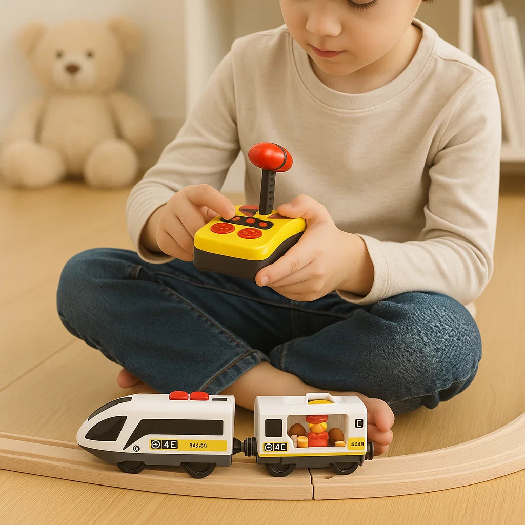 My kids love this RC train! It fits seamlessly with their wooden railway tracks and moves effortlessly around the loops and turns. The magnets are strong enough to pull extra train cars without disconnecting. The remote control is simple and works well even from a short distance. The train itself is made of durable diecast material, making it feel more premium than plastic trains. It’s the perfect combination of classic wooden train fun with modern remote control excitement!